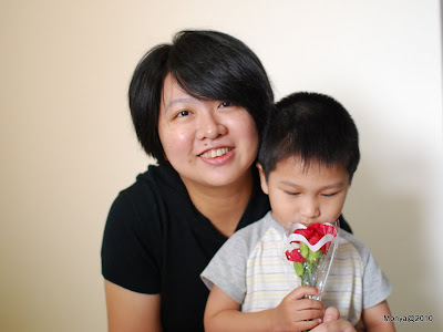 大寶手上拿著一束康乃馨,很大聲的跟我說:「麻麻~母親節快樂!」